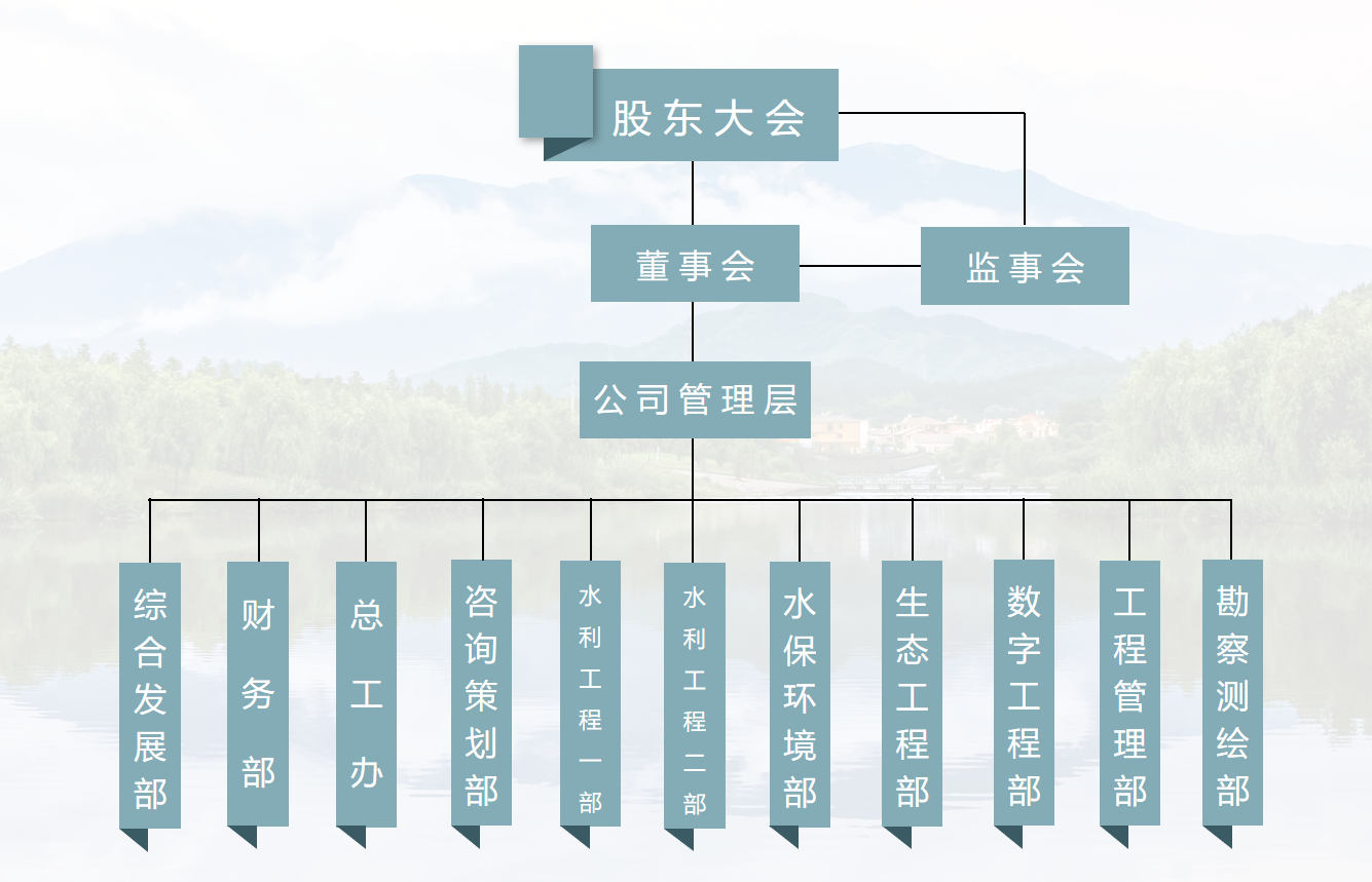 公司设有水利工程一部、水利工程二部、咨询策划部、数字工程部、生态工程部、水保环境部、工程管理部、勘察测绘部8个业务部门,以及综合发展部、财务部、总工办3个管理部门。