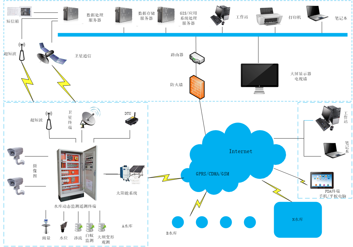 九州实时水雨情监测系统是通过接收站点的实时采集信息,对数据进行合理检查、分析处理,建立实时数据库。系统主要由数据采集装置、通讯、中心数据处理软件组成,实现了降雨量、库水位、大坝渗压、渗流、浸润线的自动化监测。为保障适度蓄水和安全度汛提供准确、及时的现场信息,为安全管理与运行调度提供及时准确的信息,及时预警,为相关部门和领导科学决策提供依据,提高工程管理的效率和质量。