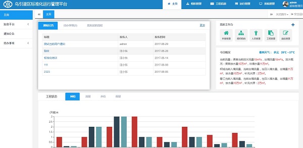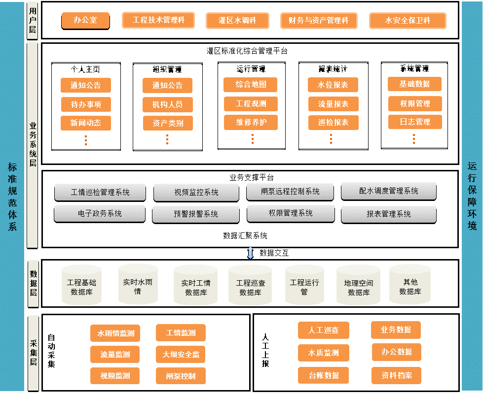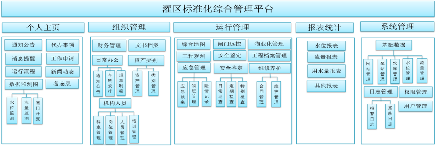 灌区标准化综合管理平台是集日常办公和灌区管理工作于一体的综合管理平台,平台重点解决灌区工作人员在监测监控、预警报警、量水测水、配水调度、防汛减灾及工程项目管理等方面的实际应用问题。在《浙江省大中型灌区运行管理规程(试运行)》的框架下,针对灌区实际情况,提出个性化解决方案,达到节约灌溉用水和科学、高效管理灌区的目的。